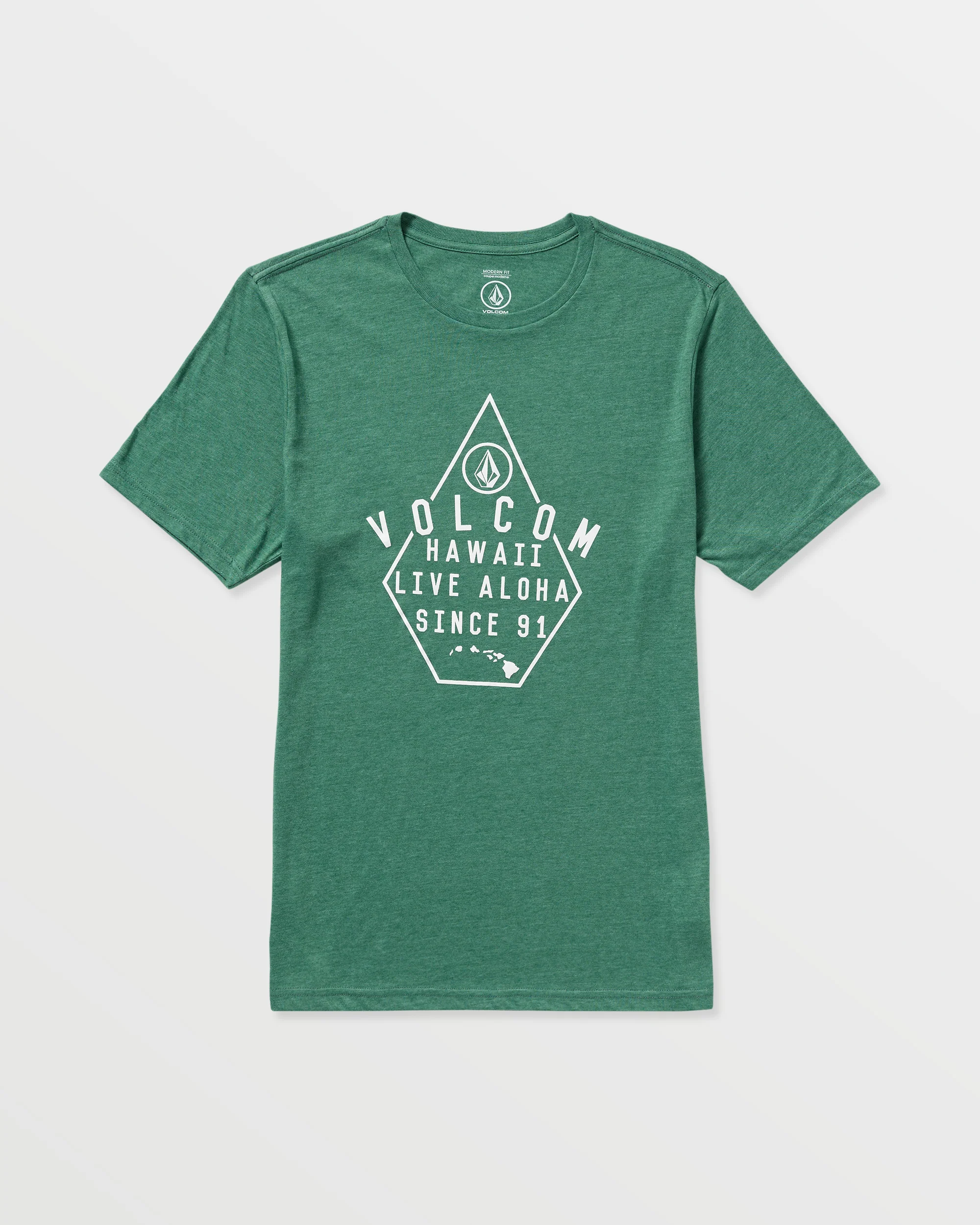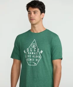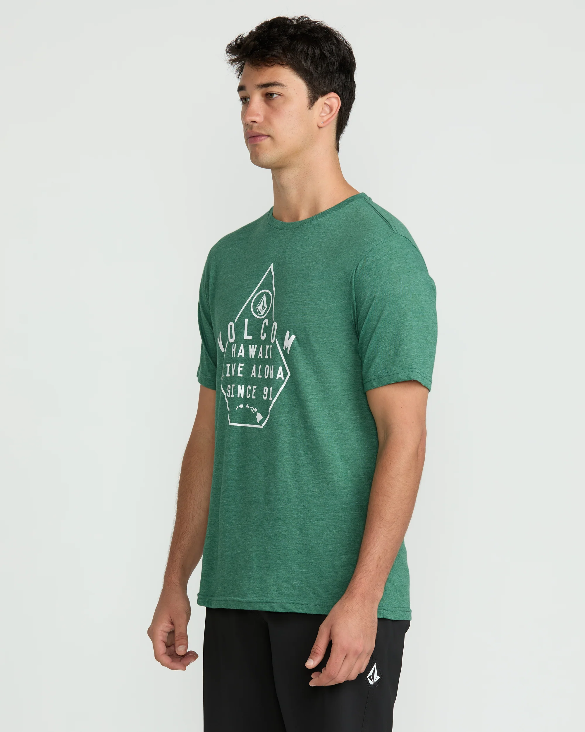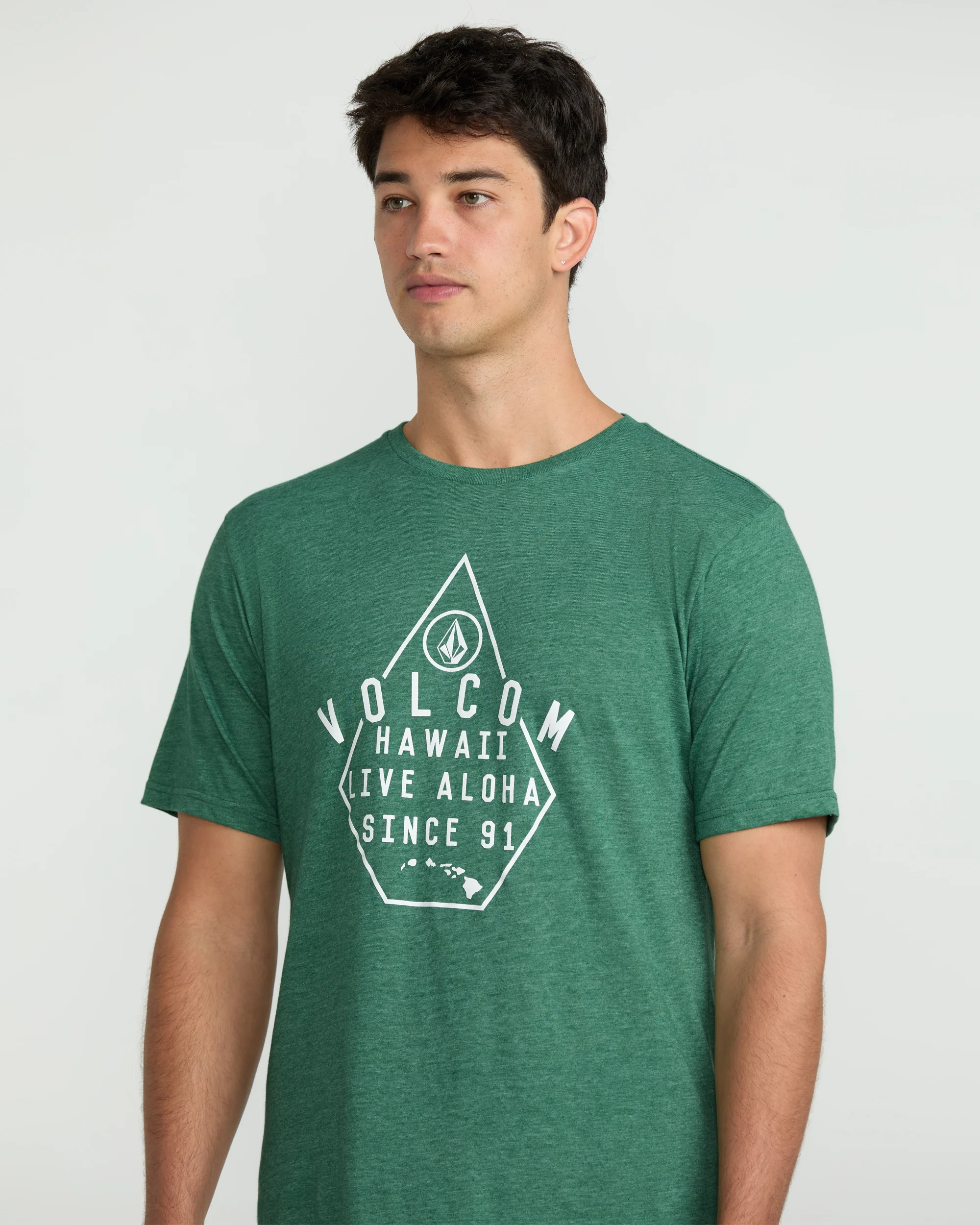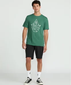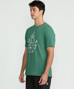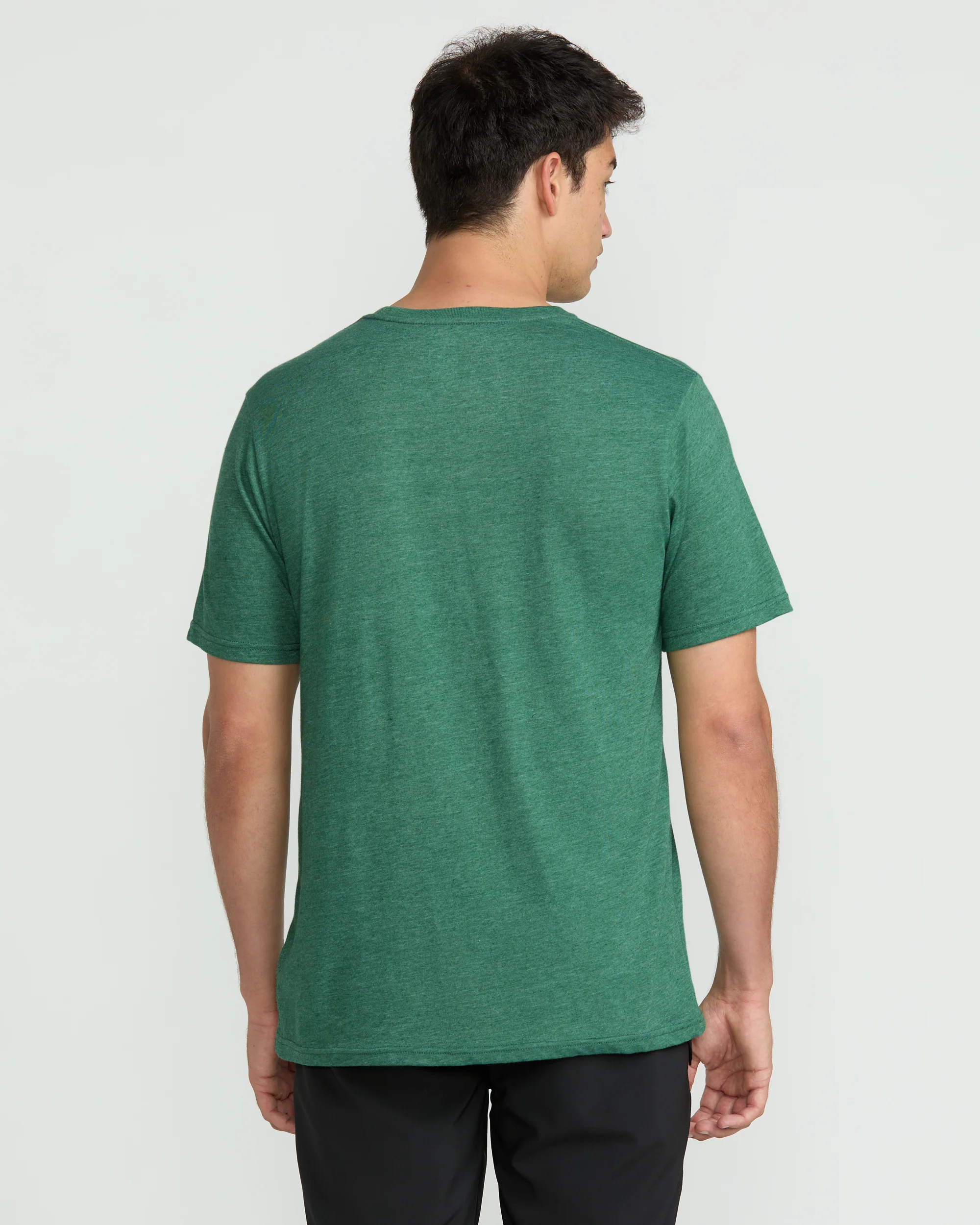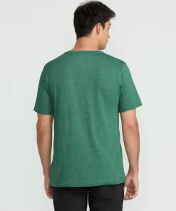 A heathered cotton-poly blend tee with a modern fit. Soft crackle ink graphics, interior-exterior branded details. Elevated yet easygoing style.