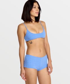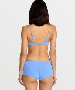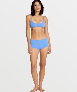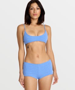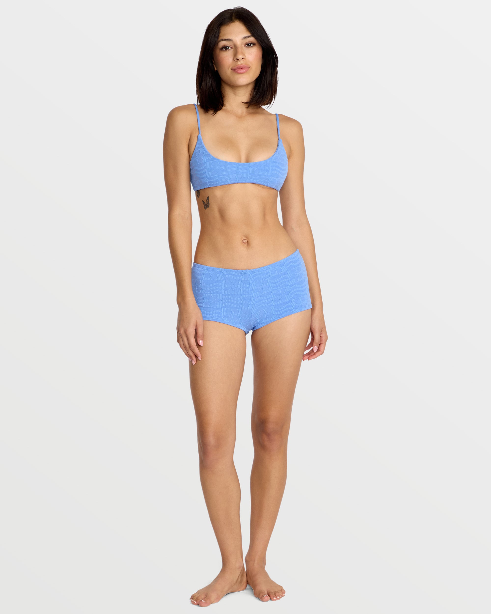 A low-scoop crop bikini top in a recycled polyester blend with removable cups and adjustable straps. Stylish metal rivets detail. Sustainable yet sexy.