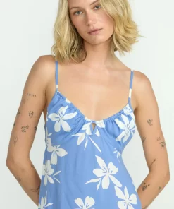 This viscose blend midi dress flatters with a fitted upper and flowy sweep. Adjustable spaghetti straps and a cutout tie back lend feminine flair, while a metal badge elevates the look. Effortless versatility for day-to-night chic.