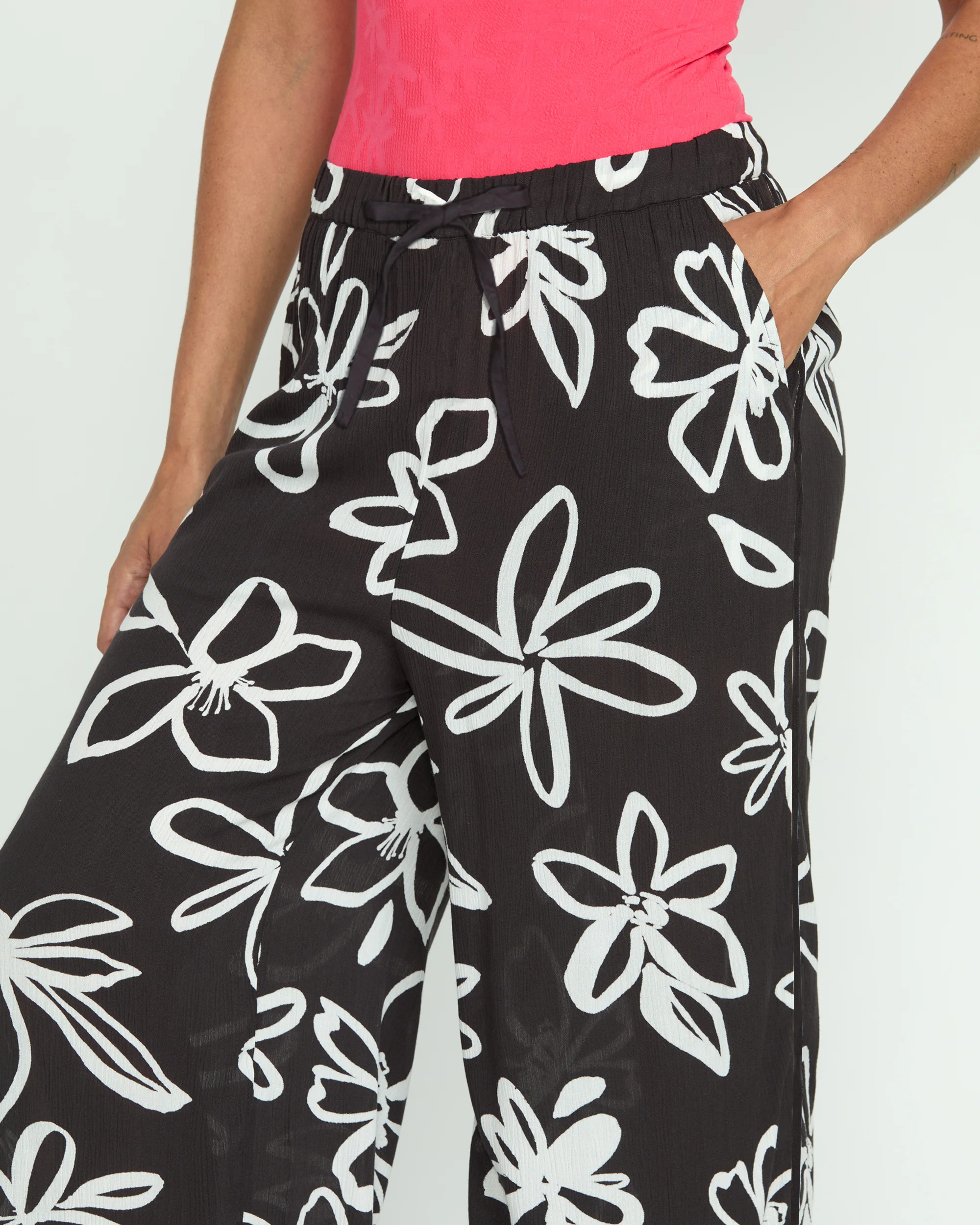 Breezy viscose crinkle gauze pulls on with an elastic drawstring waistband. Allover printed pattern and wide billowy legs beckon sea breezes. Slash pockets stash sundries.