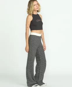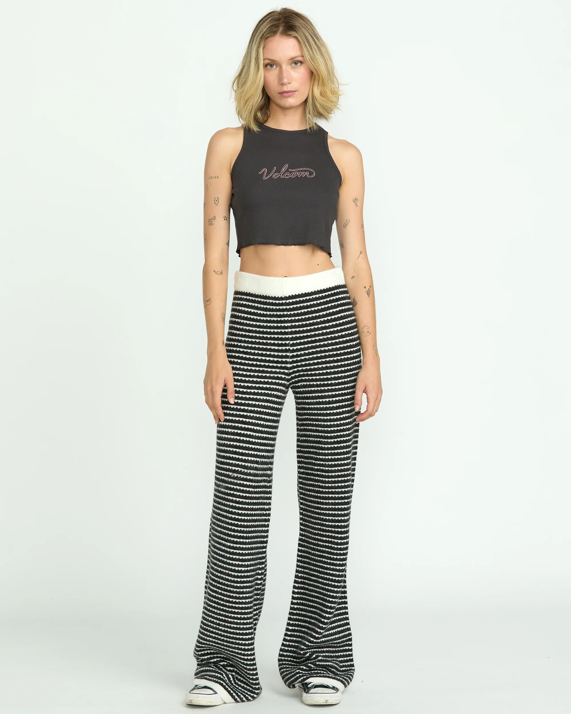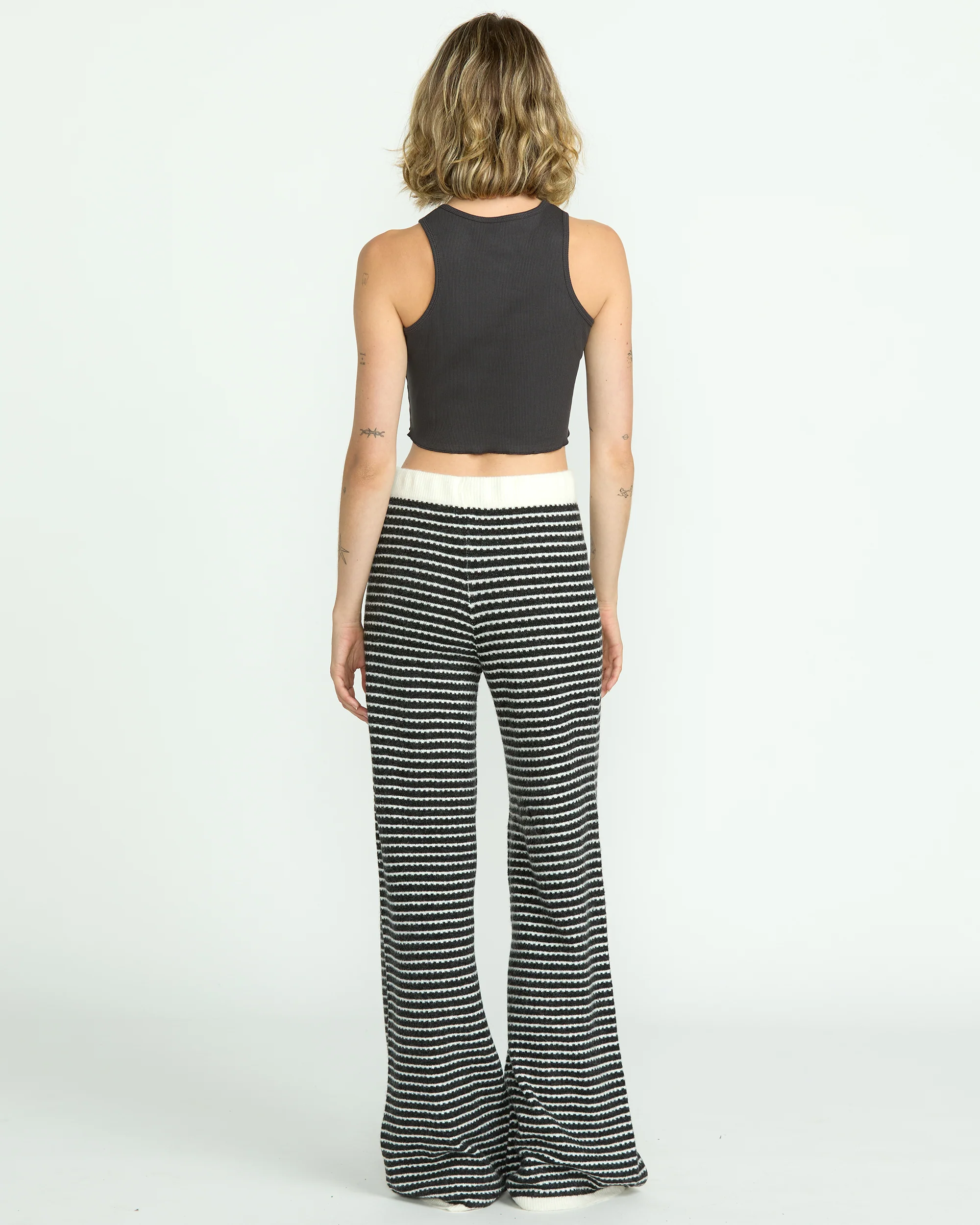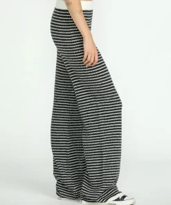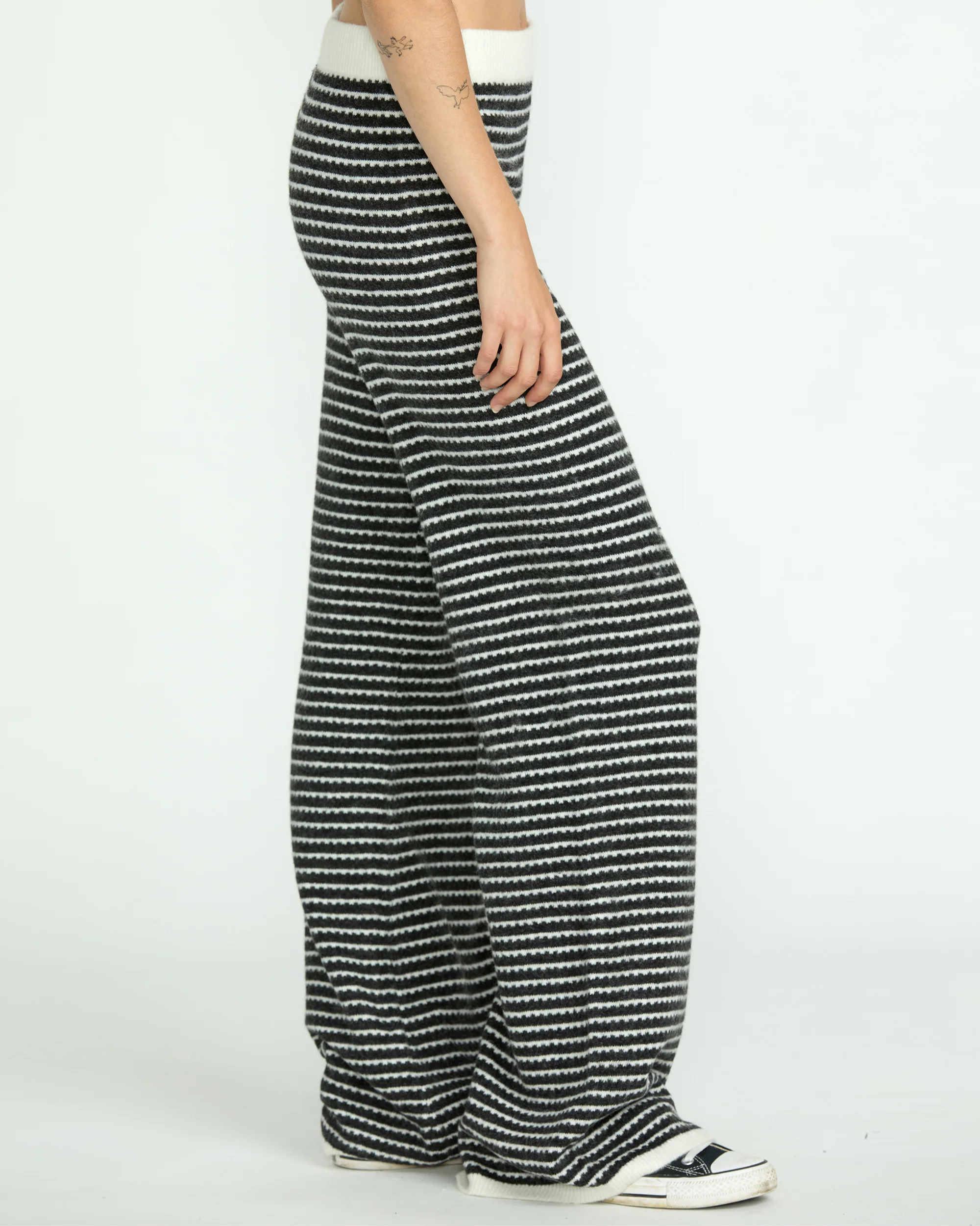 Cozy poly-acrylic-wool blend sweater pants with bold geometric stripes. Relaxed, flare-leg silhouette meets designer flair-elastic waistband, subtle metal badge. Comfy loungewear elevated.