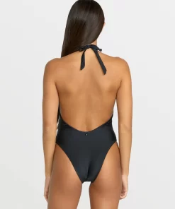 Fiercely flattering modern simplicity: this recycled nylon blend halter one-piece offers chic seamless construction, subtly sexy skimpy coverage, riveted back detail and tie-back adjustability.