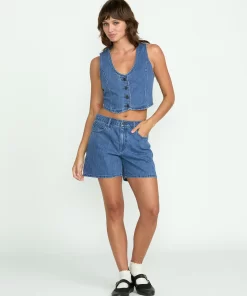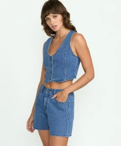 This denim vest marries rugged cotton with stripes and princess seams. A back adjuster provides a tailored fit, while the sew-down label brands this versatile layering piece.