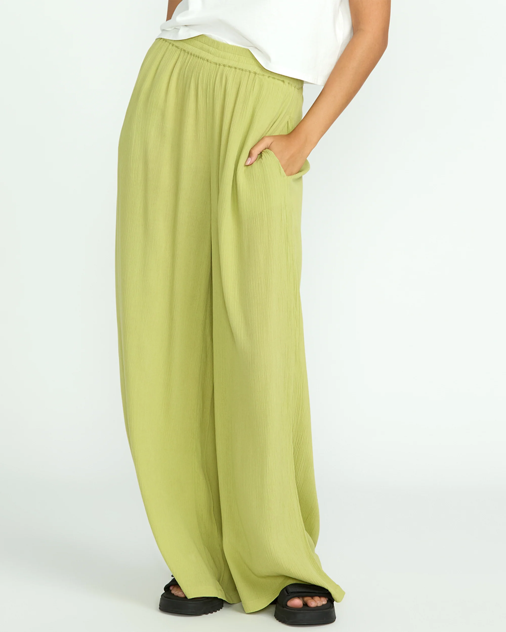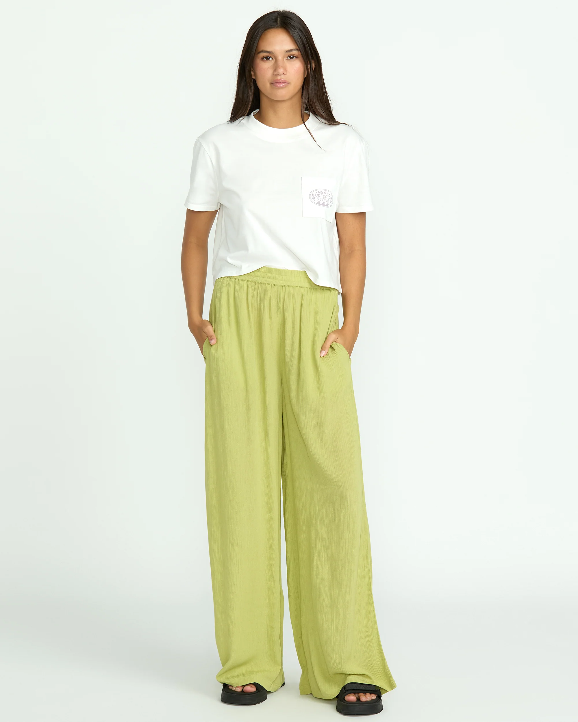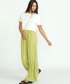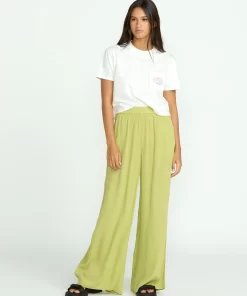 This viscose crinkle gauze pull-on keeps it breezy with relaxed wide legs, handy pockets, and side slits. Finished with a signature Volcom metal badge for laid-back beach style.