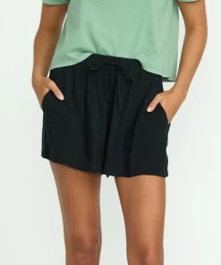 Breezy viscose crinkle gauze blend in flowy, relaxed pull-on style. Drawstring waist, side pockets, 2.5" inseam with metal badge. Premium casual shorts for warm days.