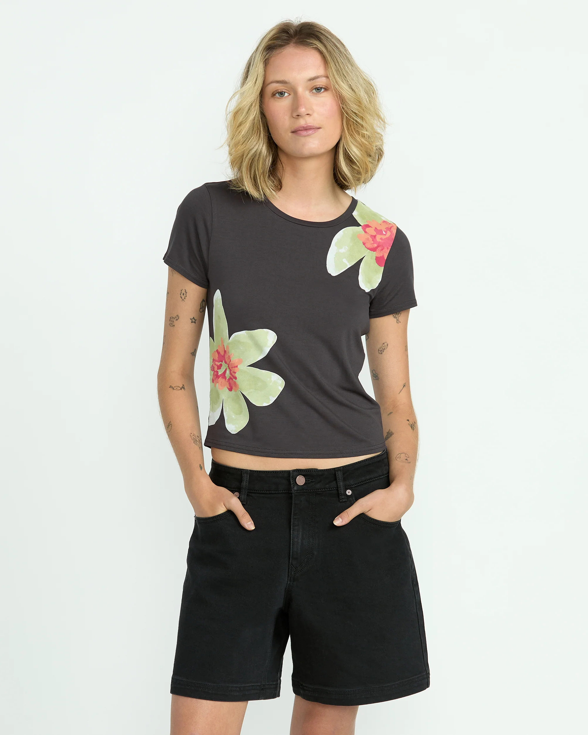 Casual, effortless cool: these high-rise boyfriend denim shorts boast a stretchy 99% cotton blend for all-day ease and breathability. Subtle branded touches and raw distressing lend a laidback yet elevated look.