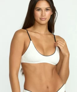 Scoop crop bikini top with removable cups, adjustable straps, and center-back closure in recycled polyester-elastane blend. Contrast piping and metal rivet details add flirty flair.
